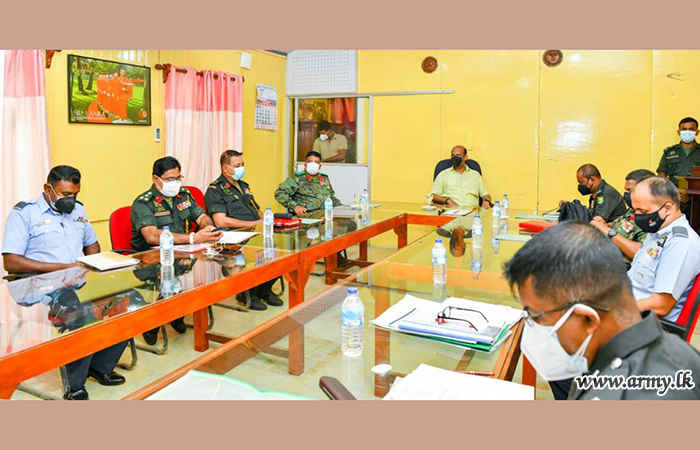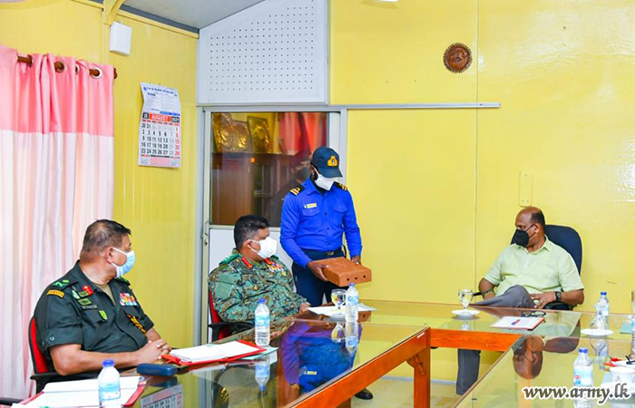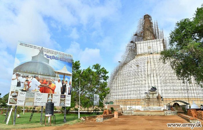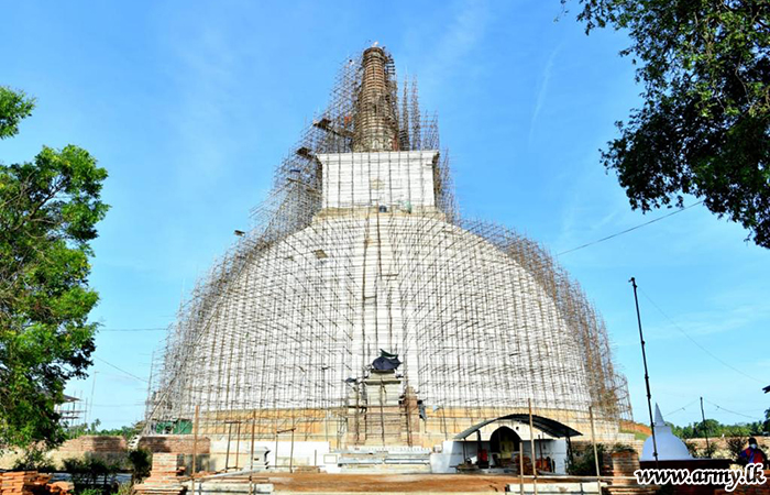 As arrangements are underway to place the ‘Crest-Gem’ (Chudaa Maanikya) and the sacred pinnacle (Kotha) at the pointing tip of the Stupa shortly upon culmination of exposition of the ‘Crest-Gem’ and the ‘Sacred Pinnacle’ which are being taken round the country at present, the visiting Secretary Defence, Chief of Defence Staff, Major General Hemantha Bandara - Commander, Security Forces - Wanni, Senior Tri Service Officers and Major General Mohan Rathnayake - General Officer Commanding 21 Division and those in charge of the project afterwards sat together for a brief meeting to evaluate the progress.