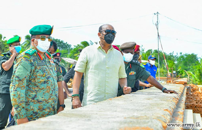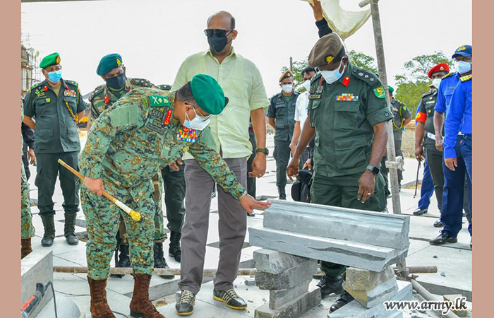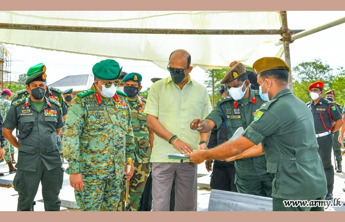 During the visit, General Gunaratne (Retd) closely reviewed the construction progress and remaining tasks, yet to be completed and discussed basic groundwork, related to the proposed Bodhigaraya (Bodhiya House), Dolos Mahe Pahana (eternal lamp), stone engravings and the land area earmarked for the devotees’ vehicle park before he had a close look at the new image house (Shrine), Museum and construction of the sacred stone-paved courtyard (Salapathala Maluwa).