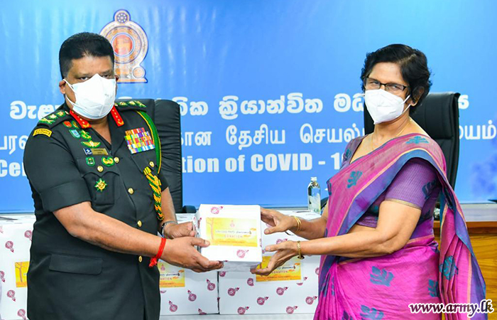 Dr Padma Gunarathna, SLMA President at the end of the weekly NOCPCO meeting symbolically handed over the stock to General Shavendra Silva, Head, NOCPCO, Chief of Defence Staff and the Commander of the Army in the presence of the Director General of Health Services as the first consignment, worth about Rs 1 million, made available through the SLMA’s ‘COVID Sahana’ welfare branch.