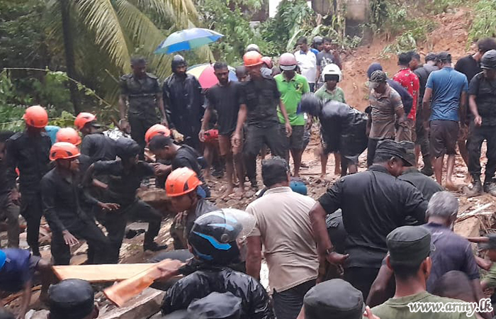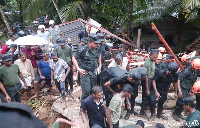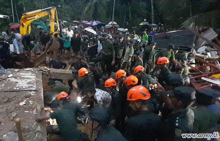 On the directions of Major General Deepal Pussella, Commander, Security Forces - West, troops of the 61 Division and 58 Division under the guidelines given by Major General Mohan Rathnayake, General Officer Commanding, 61 Division,Major General Wipula Ihalage ,General Officer Commanding, 58 Division, Brigadier Sujeewa Eregoda, 611 Brigade Commander are engaged in rescue and clearing operations with the participation of Lieutenant Colonel Sri Samarasinha, Commanding Officer, 1 SLSR, Major Ajith Ekanayake, Commanding Officer, 8 SLSR and Disaster Management Officials.