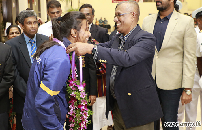Major General R.A.J.N Ranasinghe RSP USP, Chairman of Sri Lanka Army Athletics Committee and General Officer Commanding, 62 Infantry Division, Brigadier V.M.N Hettiarachchi RWP RSP, Vice Chairman, Sri Lanka Army Athletics Committee and Commander, Commando Brigade, Colonel H.M.S.P.S De Silva RSP USP, Colonel Sports, Lieutenant Colonel G.R.R.K.S Jayarathne RSP psc IG, Secretary, Army Athletics Committee, Rear Admiral Shemal Fernando (Rtd), Director of the Sports Ministry, Several Senior Officers from Sri Lanka Air Force and Navy, Officers and Other Ranks of the Army were present there to welcome Army athletes.