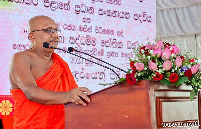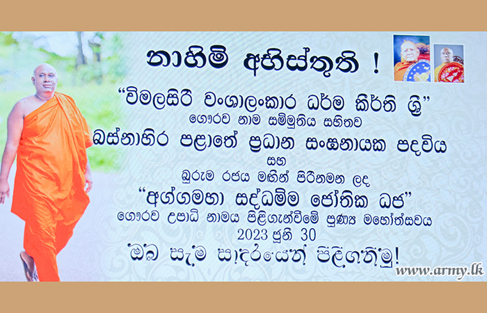 Lieutenant General Vikum Liyanage RWP RSP ndu, Commander of the Army as the Chief Guest presented the "Aktha Pathra" (Act of Appointment) to Ven Getaberikande Rathanasiri Thero, Chief Incumbent of Jayathilakarama temple at Peliyagoda who has been appointed as the Chief Sangha Nayake for Western Province along with the honorary title of 'Wimalasiri Wanshalankara Dharmakeerthi Sri' and conferred "Aggamaha Saddhamma Jothika Dhaja" honorary designation.