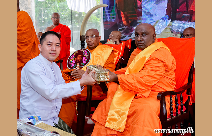 Lieutenant General Vikum Liyanage, presented the "Aktha Pathra" while Mr. Tha Thu, Human Resource Management Consultant at Embassy of Myanmar awarded the "Aggamaha Sadhdhamma Jothika Dhaja" credentials to the Nayake Thero. Army Chief also presented a memento to the Nayake Thero in appreciation of his service to ‘Sasana’.