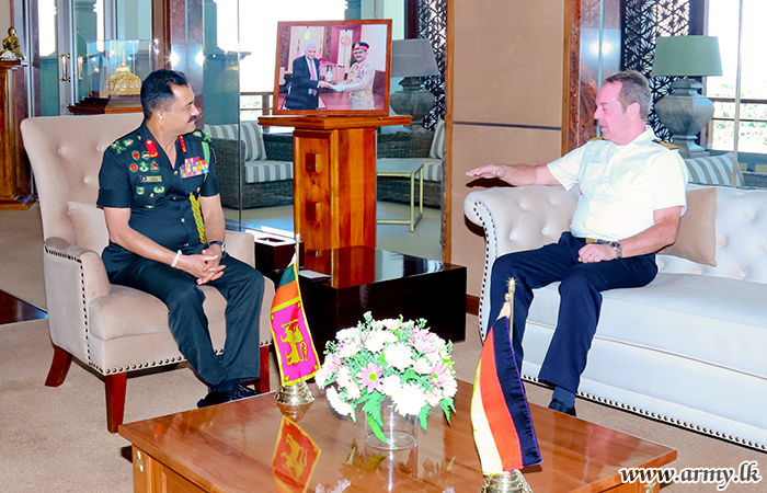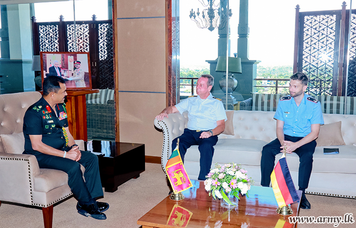Captain Gerald Koch, Defence Attaché together with Lieutenant Colonel André Niedhoefer, Deputy Defence Attaché of German Embassy in New Delhi, India, accredited also to Sri Lanka, Nepal and Bangladesh, during a visit to Sri Lanka paid a courtesy call on the Commander of the Army, Lieutenant General Vikum Liyanage RWP RSP ndu at the Army Headquarters on Monday (16 Oct).