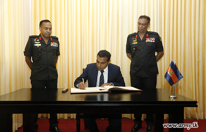 Later, the State Minister of Defence joined an All-Rank tea arrangement where he took some time off to speak to them individually. Prior to his departure, he penned down some complimentary remarks in the visitors' book.