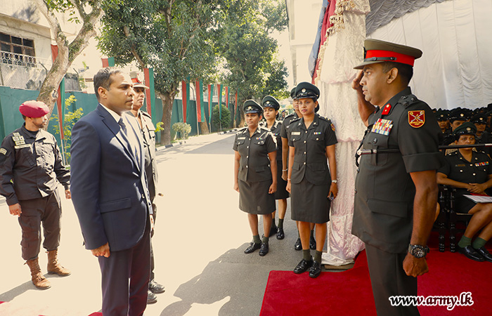 On arrival at the entrance, the State Minister of Defence was greeted in a Guard Turnout, presented by SLAWC troops before he was received by Major General U.D Wijesekera RWP RSP USP rcds psc, Commandant of the Sri Lanka Army Volunteer Force and Colonel Commandant of SLAWC together with Brigadier J.K.R Jayakodi RWP USP, Centre Commandant of SLAWC.