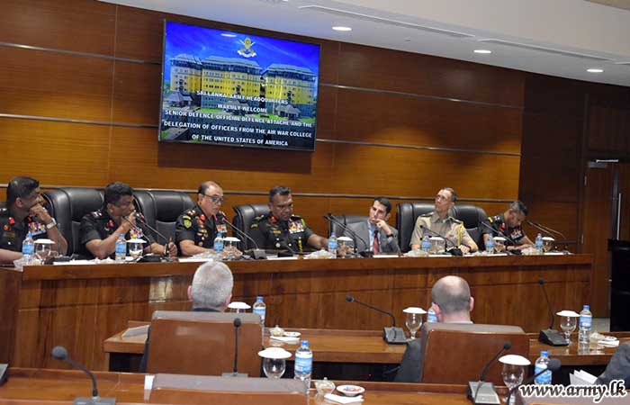 A delegation of 12 students pursuing Master of Strategic Studies at the Air War College in United States, accompanied by Colonel Adam Hilburgh, Head of the Department of Strategy Air War College arrived at Army Headquarters on 05 March 2024. Upon arrival, Brigadier P.C.L. Gunawardana RWP RSP psc, the Director, Directorate of Research Concept and Doctrine, warmly welcomed the delegation.