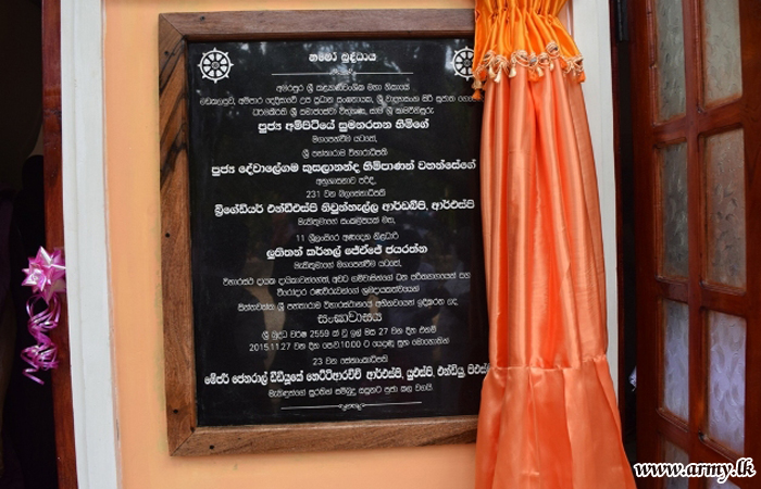 The newly-constructed ‘Sanghawasa’ at Sri Patharama Viharaya, Sinnawatte, Vellaveli was declared opened by Major General D.D.U.K. Hettiarachchi, General Officer Commanding, 23 Division on Friday (27).