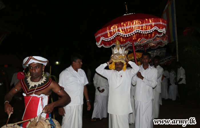 Ven. Millawe Sumanathissa thera chief incumbent, Purvarama Vihara, Moragahahena, and Ven. Ingiriye Dhammalankara, Chief Prelate, Lumbini Vihara, Kilinochchi, together with 35 other members of the Maha Sangha were conducted to the temple premises for chanting in a colourful procession.