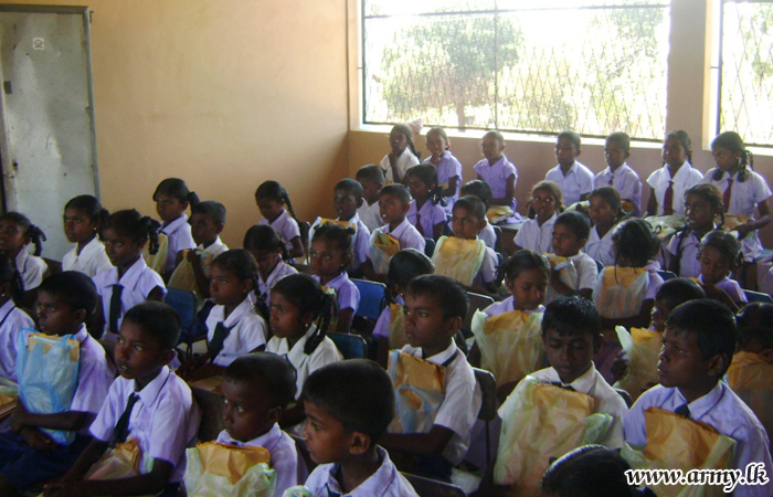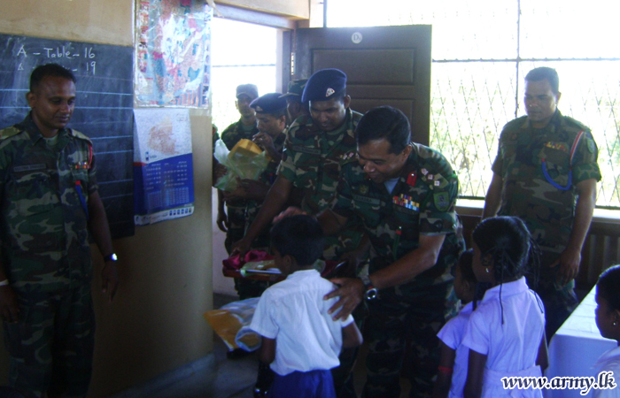Colonel J.M.C. Jayaweera, Commander, 233 Brigade distributed those gift packs among 50 students during a cremony in the Mankerni Primary School in Madurankulam area.