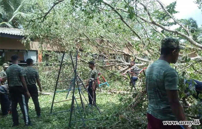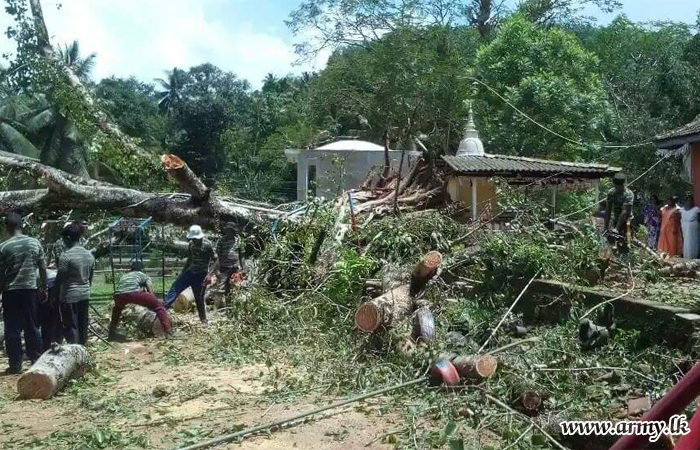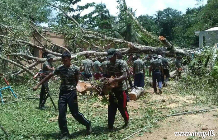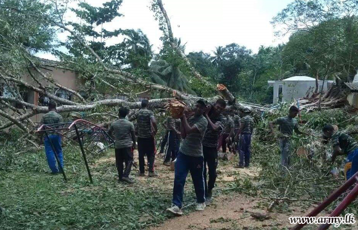 9 Gemunu Watch (GW) troops serving the 581 Brigade under the Security Forces Headquarters - West (SFHQ-West) quickly came forward and removed a fallen Bo tree on the roof top of the Gapiligoda Primary School in Mathugama on Thursday (02).