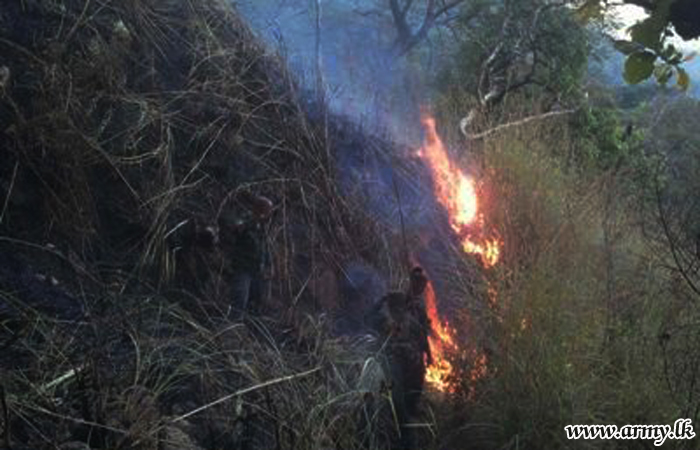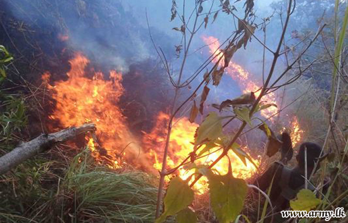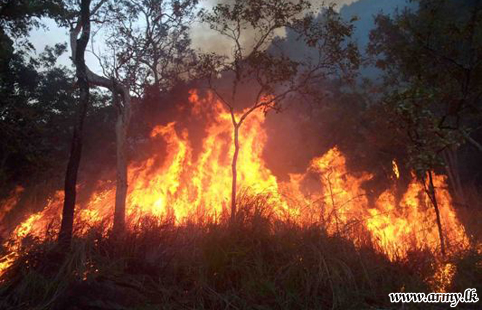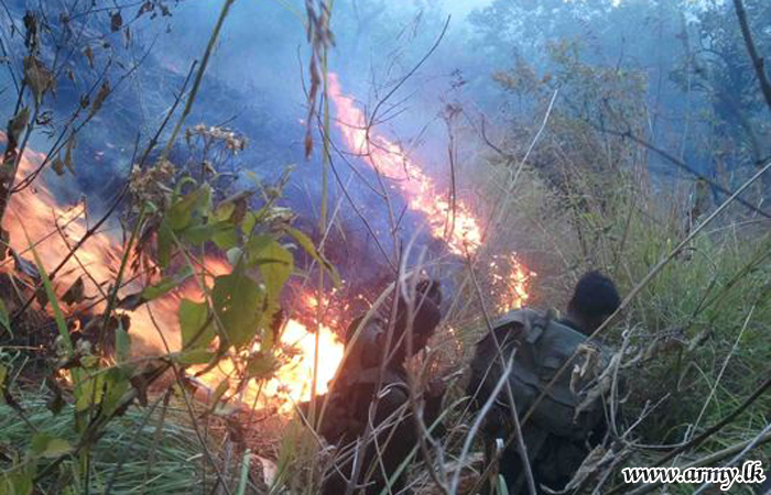 The fire that broke out late Tuesday night was brought to the notice of the troops of the 18 Battalion the Gemunu Watch (18 GW) serving Wellawaya area under the 121 Brigade who reached the area swiftly and brought it under control.