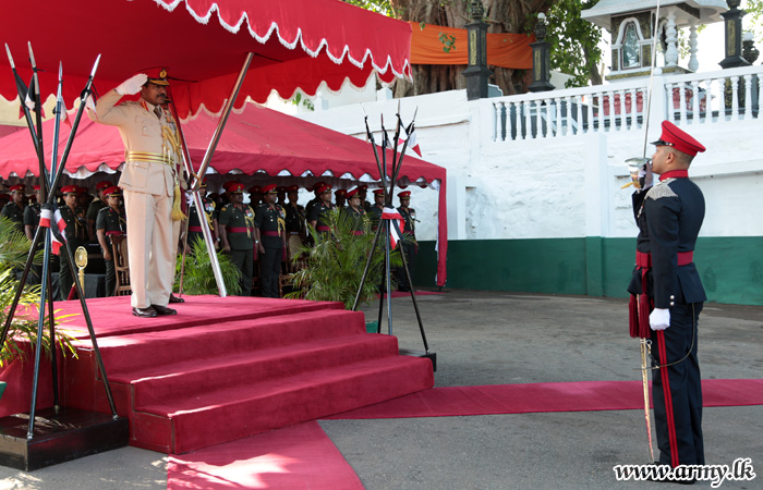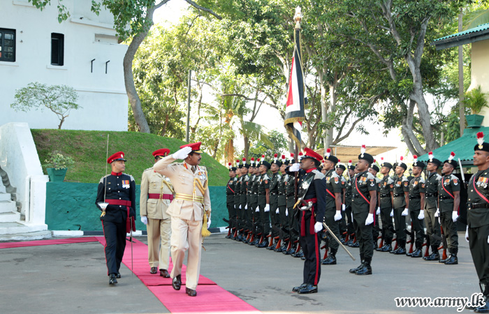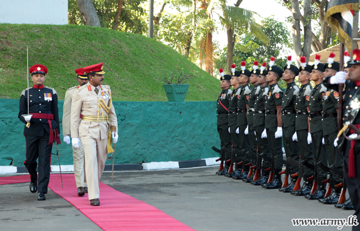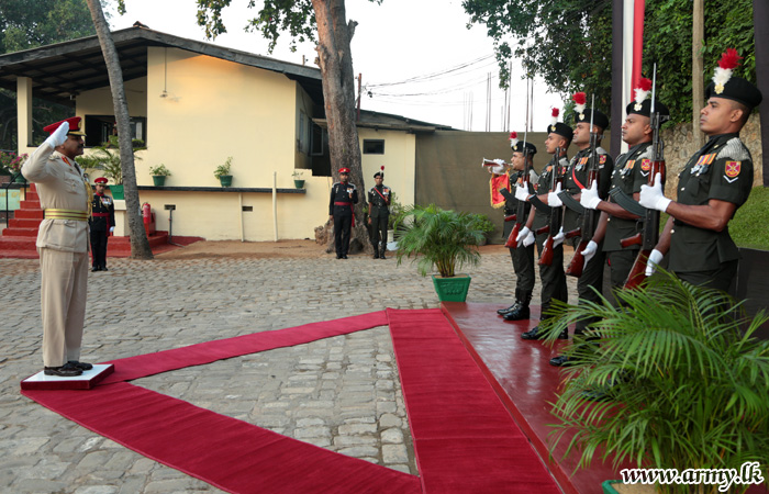 The new Colonel Commandant was greeted to a Guard Turnout, presented by troops of the Regimental Headquarters of the SLAC on arrival. Later on he was honoured in a parade, inclusive of Regimental Colours.