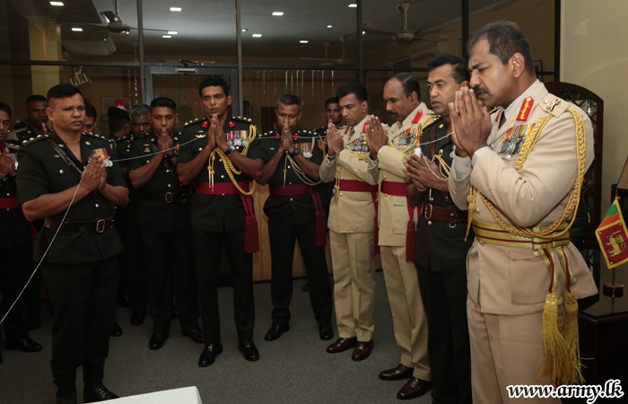 As a symbolic gesture of his acceptance of command, Major General Sathyapriya Liyanage placed his signature for a formal document in the presence of Council members, Commanding officers and the staff at the Regimental Headquarters after a brief religious observances.
