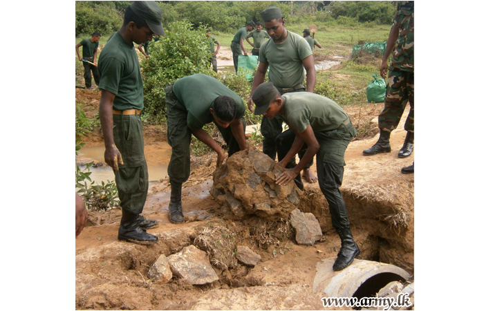 Troops on standby to assist flood-affected civilians in Kilinochchi area offered their support for renovation of a culvert that was washed away by floods, situated in close proximity to the Advanced Infantry Platoon Training school in Barathipuram, Kilinochchi.