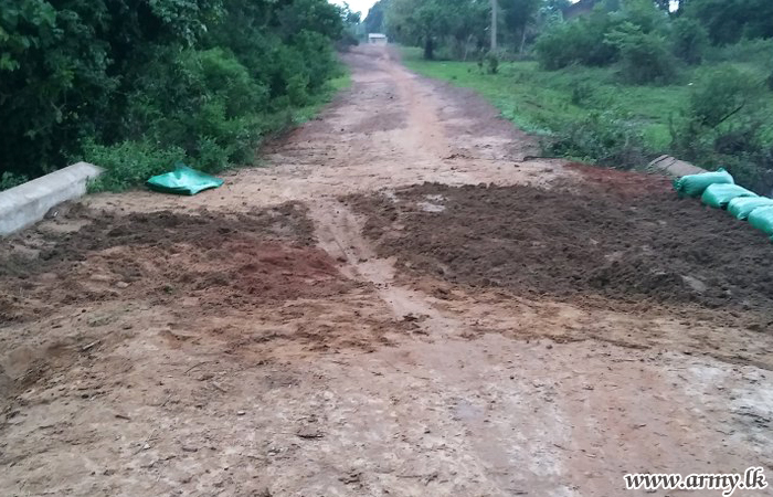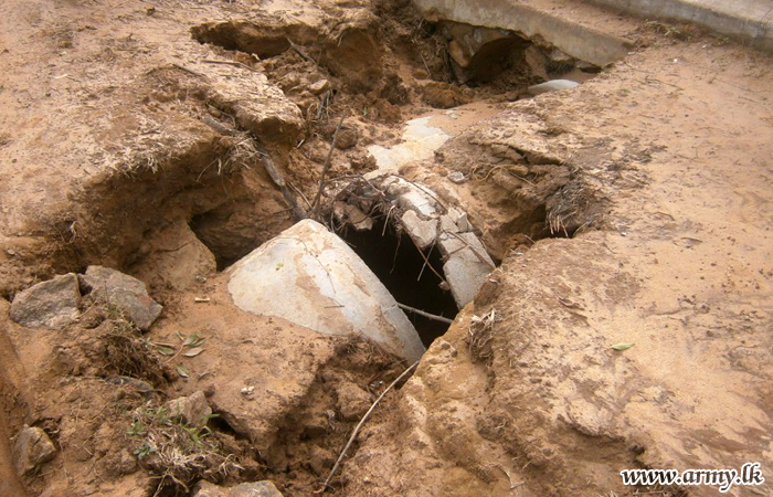 9 Vijayabahu Infantry Regiment (VIR) troops after learning that movement along the road from Barathipuram to Vinayagapuram has come to a standstill on Thursday (1) due to the part destruction of culvert went to the affected area and joined hands with local authorities and civilians for repair of the same.