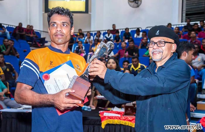 Lance Corporal M.V.I.R.S Bandara of Corps of Engineer Services in the final third round in the fight under Fly Weight (52 kgs) category against the rival, M.M Prabhashwara of Slimline, MAS Holdings, staged a knockout and claimed the victory to receive the trophy.