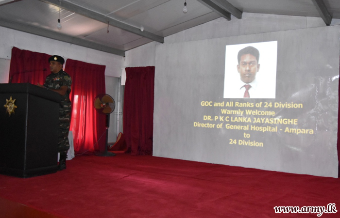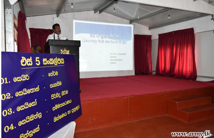 At the invitation of the General Officer Commanding, 24 Division, Dr P.K.C.L Jayasinghe, Director, Ampara Hospital delivered the lecture, referring to his own achievements by making his hospital one of the bests in the world in a ‘5 S’ competition.