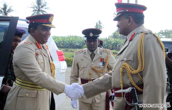 On arrival at the 52 Division Headquarters, Major General Aruna Wanniarachchi, General Officer Commanding, 52 Division welcomed him before the troops of the 12 Gemunu Watch saluted him in a formal Guard Turnout. GOC, 52 Division gave him an update on present commitments and ongoing projects in the 52 Division area.