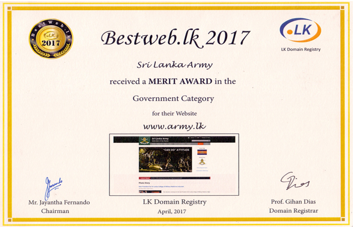 The flagship of the Army, www.army.lk website during a recent best website selection contest, conducted by LK Domain Registry in the state sector websites in Sri Lanka has carried a Merit Award in the government sector websites, it has been announced.