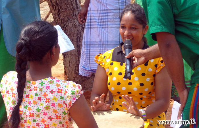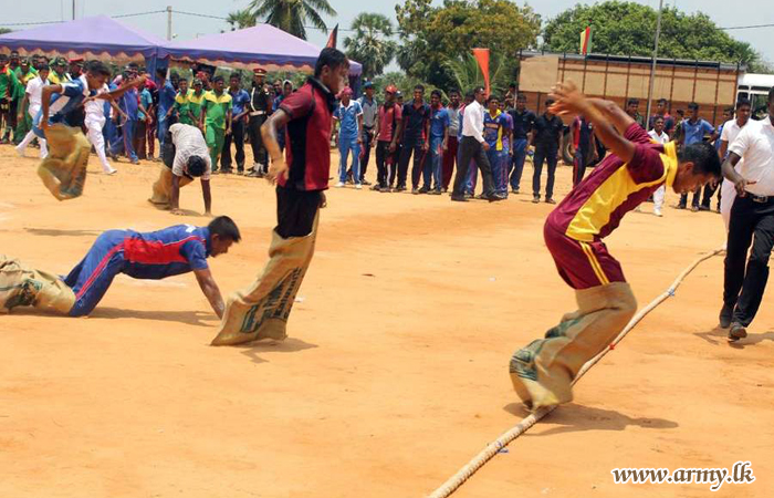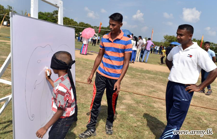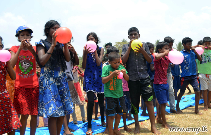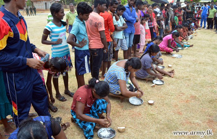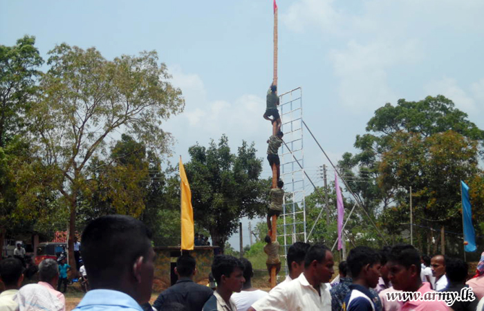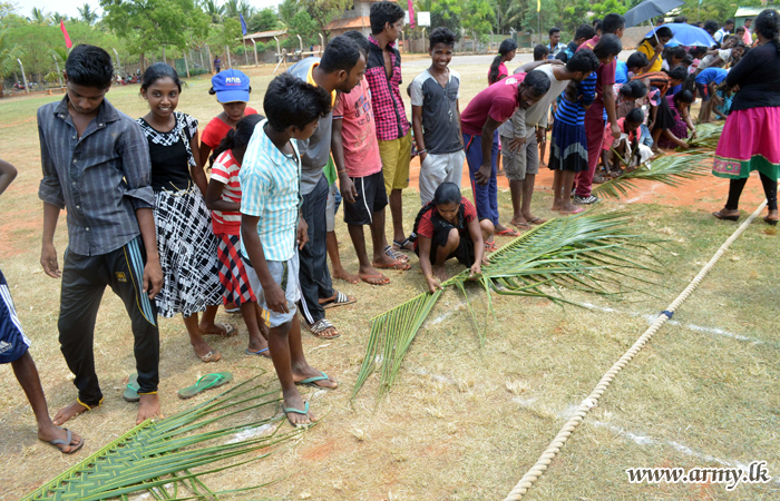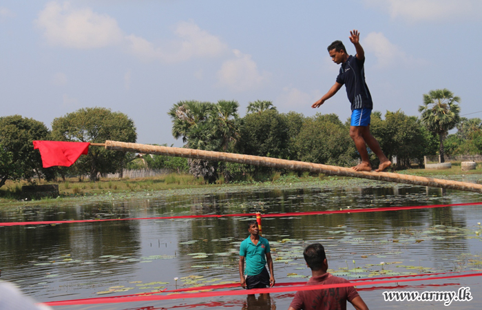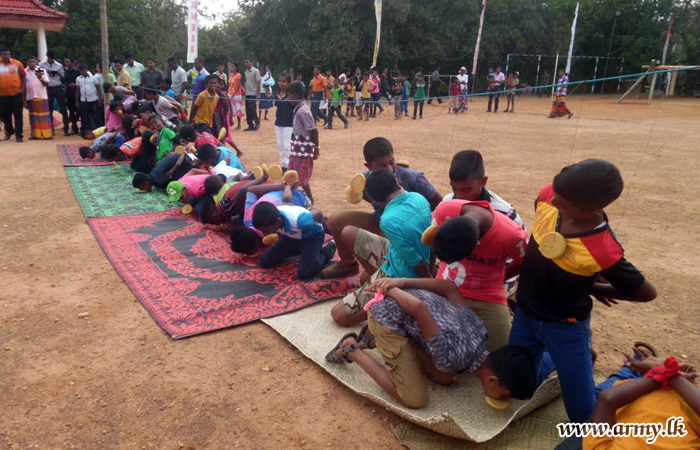 During the event, traditional and merry-making games and collective competitions, such as Raban playing, gunny bag races, eye-placing on the elephant, grease-pole climbing, finding of hidden guest, hurdle runs, cadjan weaving, lime balancing, tug-of-war, selection of New Year prince and princess were among prominent features. Civilians of different age groups enthusiastically took part in many events jointly with soldiers. Valuable prizes were also given away to winners and participants towards the end of the event.