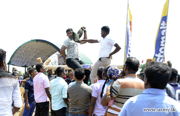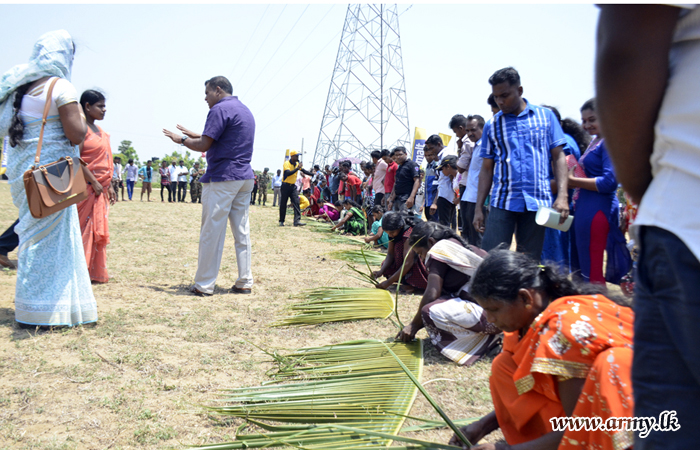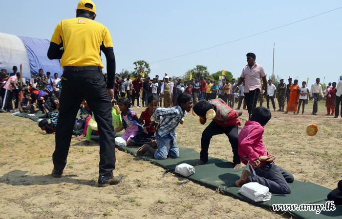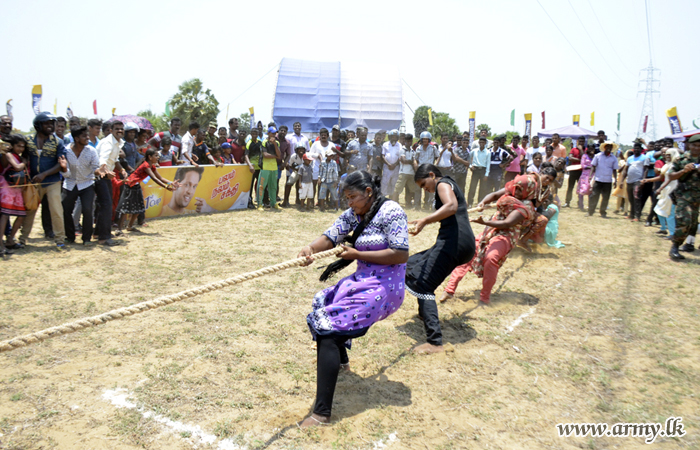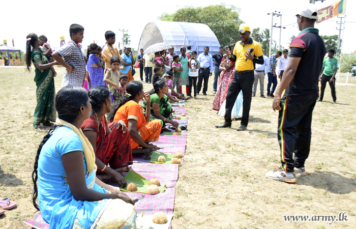 Traditional and merry-making games and collective competitions, typical of New Year times, dominated throughout the day’s arrangement, attended by Rev Fr A.V Silvesterdas of Pulopalai St Peter’s Church, Rev Prabha, Hindu Priest at Pulopalai Kovil, representatives of sponsors, OIC at Palai Police Station, Palai and Kilinochchi People’s Bank Managers, school principals, state officials, Gramaseva officials, scores of villagers and civilians around the camp premises, Officers, All Ranks, family members of All Ranks of the 55 Division and many other leading citizens in the area.