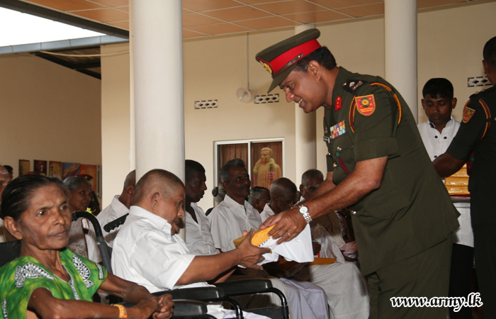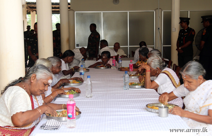 Inmates at the ‘S.K Elders’ Home at Malayalapuram, Kilinochchi were entertained to a sumptuous lunch and given gift parcels on account of the ‘Vesak’ festival on Thursday (11) after arrangements to this effect were jointly coordinated by the Security Force Headquarters - Kilinochchi (SFHQ-KLN), 57 Division Headquarters, 571 Brigade Headquarters and the troops of the 9 Vijayabahu Infantry Regiment (VIR).