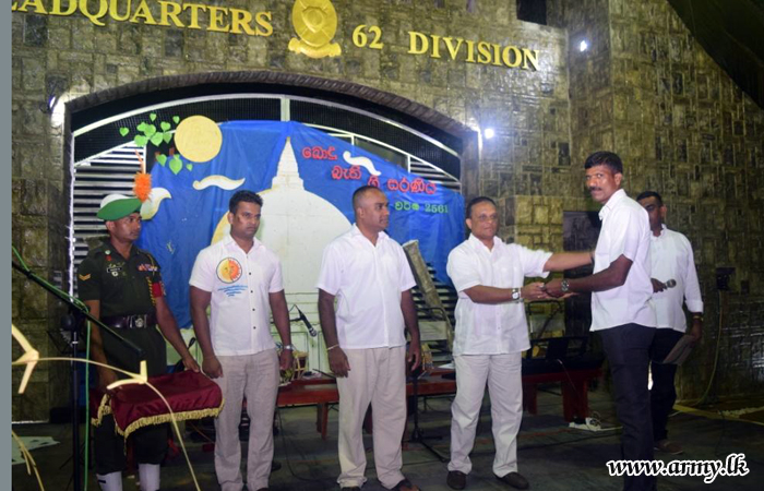 62 Division Headquarters meanwhile organized a series of religious programmes to celebrate the 2561th Vesak festival during 10-11 May on the directions of the General Officer Commanding, 62 Division, Brigadier Sanjaya Wanigasinghe.
