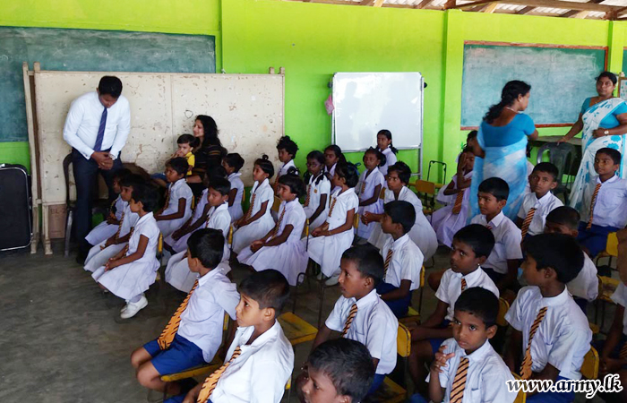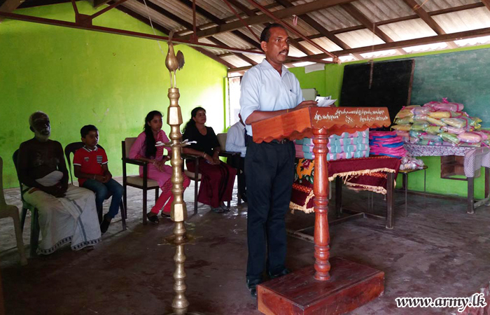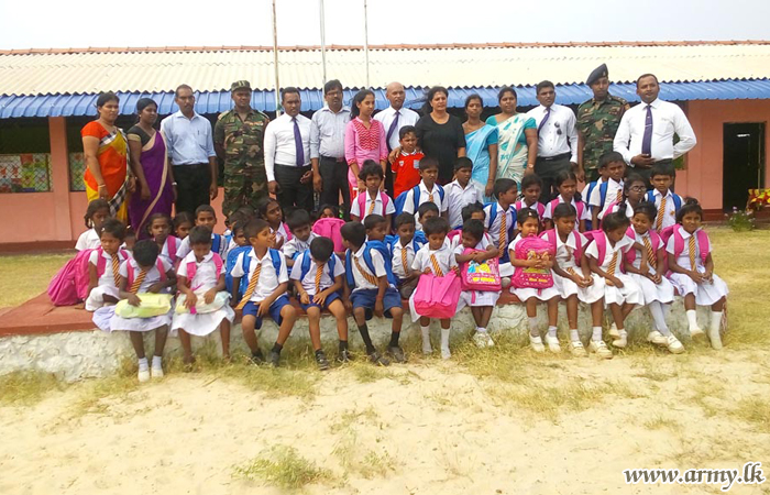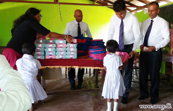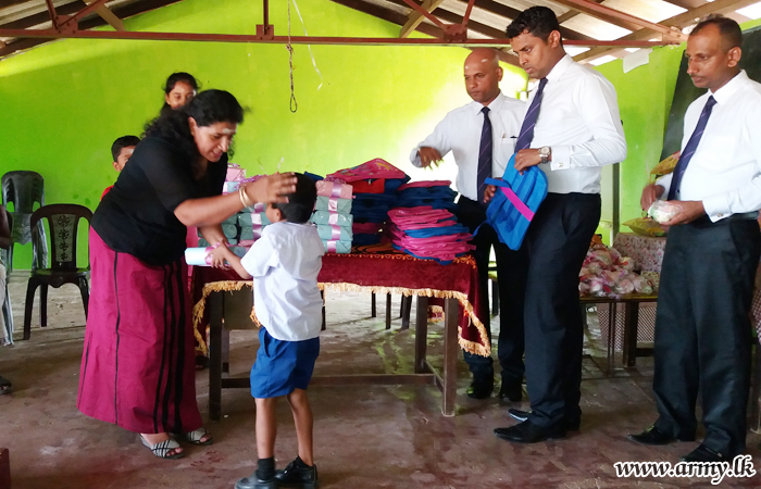 Troops of the 15 (V) Vijayabahu Infantry Regiment (VIR) under the 66 Division of the Security Force Headquarters-Kilinochchi (SFHQ-KLN) with the sponsorship received from the ‘Soft Logic Life Foundation’ organized a distribution of a stock of educational accessories and school bags to the value of Rs 175,000/= among 44 students at Paramankirei Government Tamil Mixed (GTM) School in Pooneryn on Friday (2).