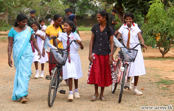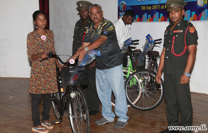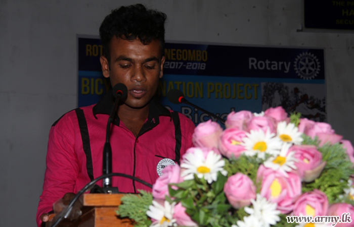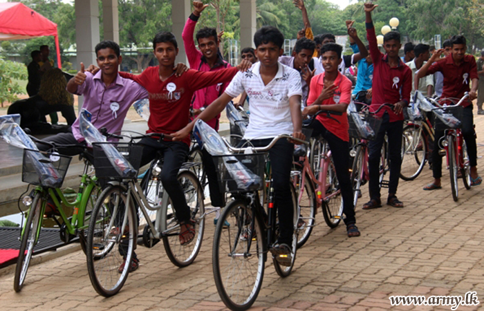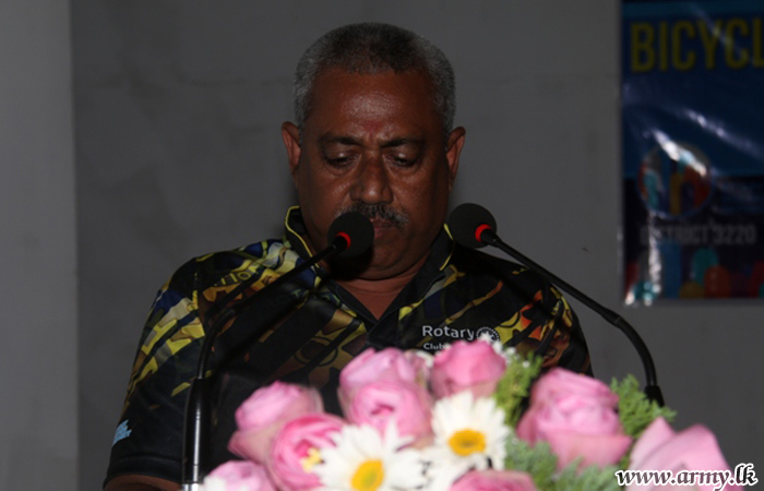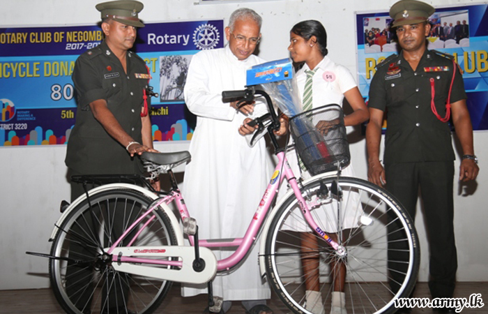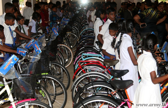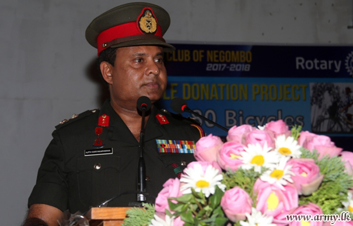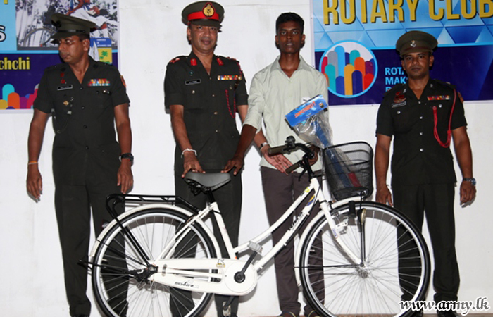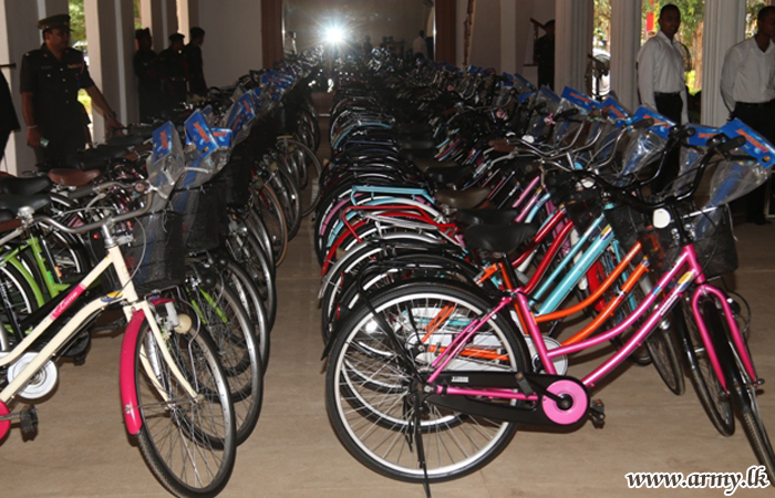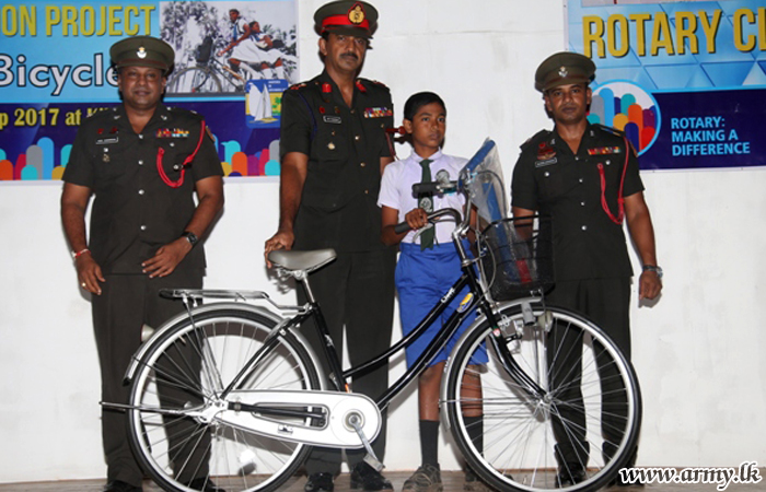 Troops of the Security Force Headquarters - Kilinochchi (SFHQ-KLN) in coordination with Negombo-Rotary Club led by Mr Freddy Cruise showed goodwill and generosity towards students living in Kilinochchi area by donating 80 push bicycles for distribution amongst low-income group students on Tuesday (5) at ‘Nelumpiyasa’ Auditorium, Kilinochchi.