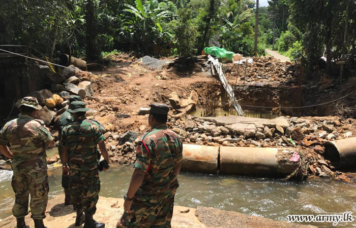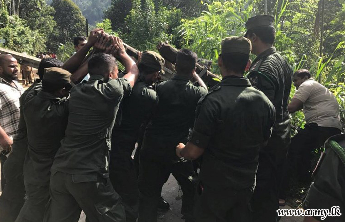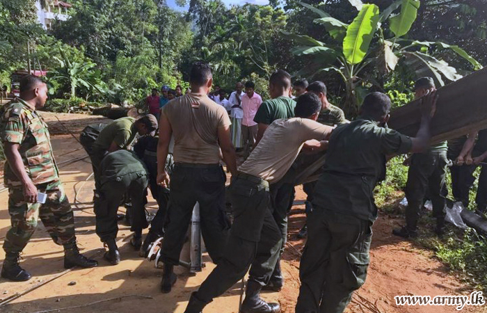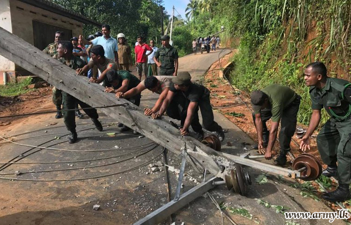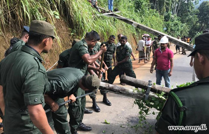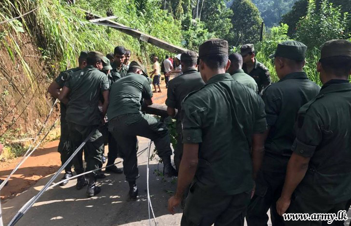583 Brigade troops had to move away three concrete lamp posts and one telecommunication post which had fallen on to the Kuruwita - Erathna main road obstructing traffic. 8 Gemunu Watch (GW) troops rushed to the scene and made the road motorable within hours despite torrential rains.
