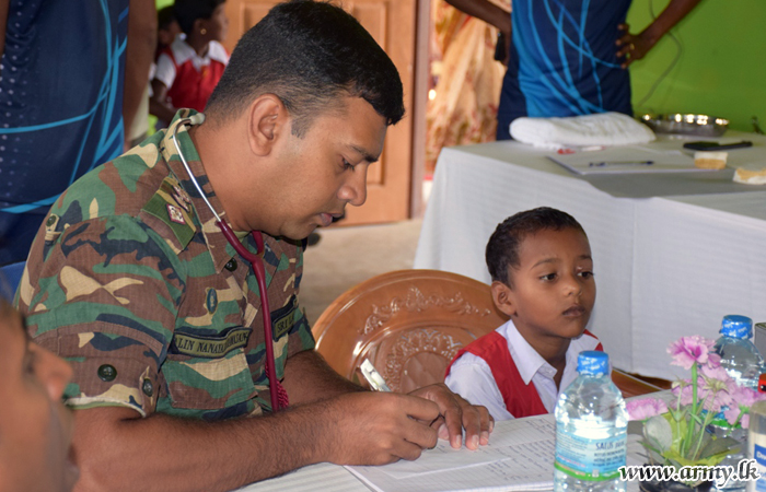 Those gift parcels, organized to match with specific sizes of recipients included shoes and socks of very high quality. In addition, 6 (V) SLAWC personnel conducted a medical clinic in the school premises with the support of 3 medical officers, following arrangements, made by the Civil Coordinating Officer of the SFHQ-KLN. All students were examined for physical ailments, dental caries and other visionary defects throughout the medical clinic.