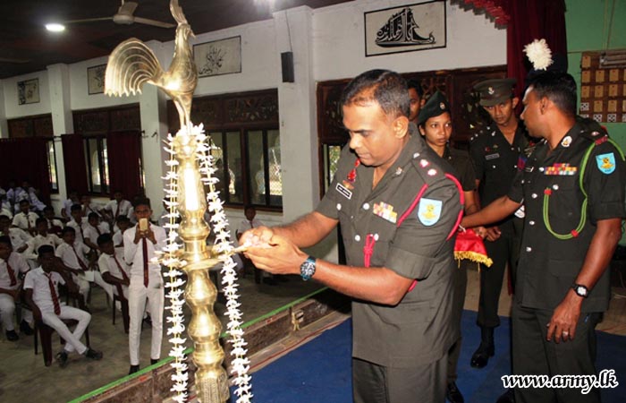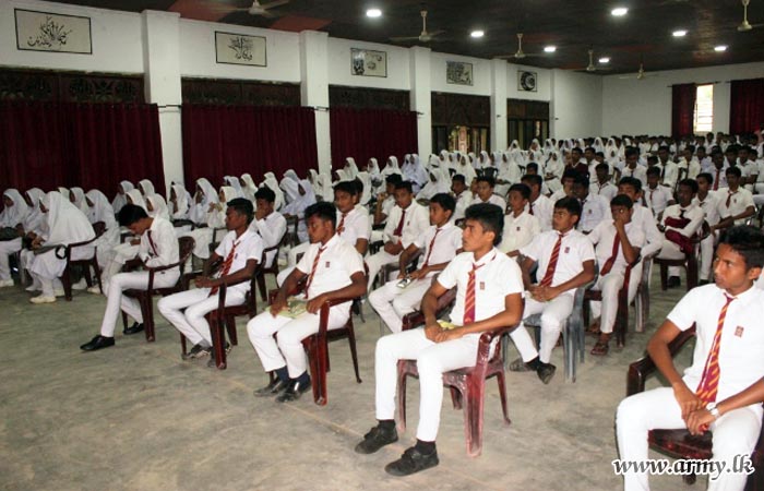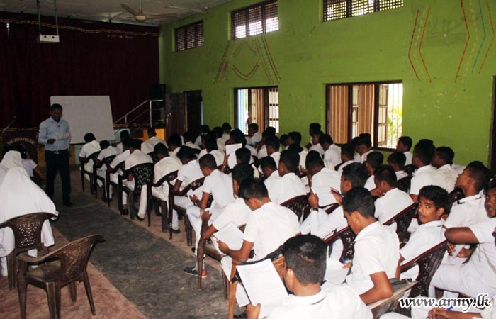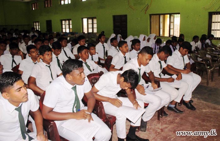 22 Division troops of the Security Force Headquarters - East (SFHQ-E) facilitated educational seminars for the benefit of students sitting the G.C.E (O/L) examination in December - 2017 at Kinniya Central College and Al–Aksha Vidyalaya, Kinniya during 25-26 November.