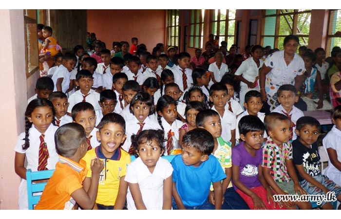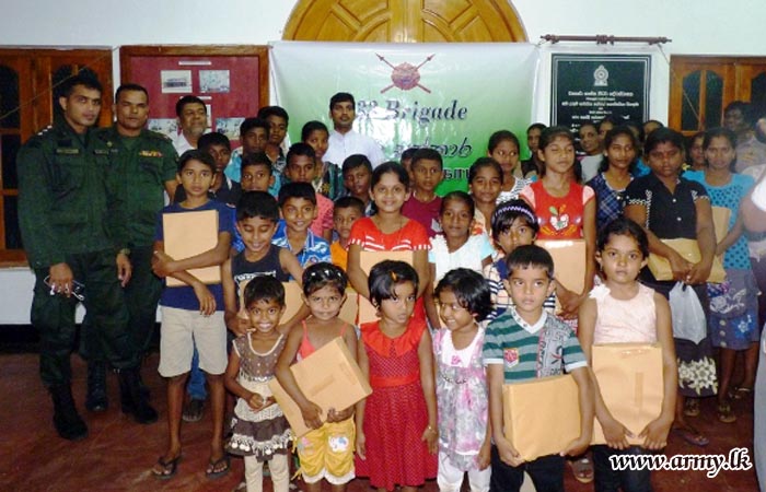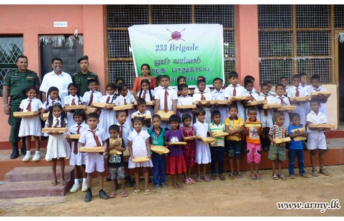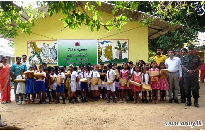 233 Brigade Headquarters of the 23 Division after a close survey found that many student in under privileged families in remote areas are unwilling to attend the schools due to absence of those school accessories. Accordingly, the 233 Brigade with the blessings of its Brigade Commander and the Commander, Security Forces - East explored the possibilities of seeking kind patronage of the People’s Bank Buddhist Society.