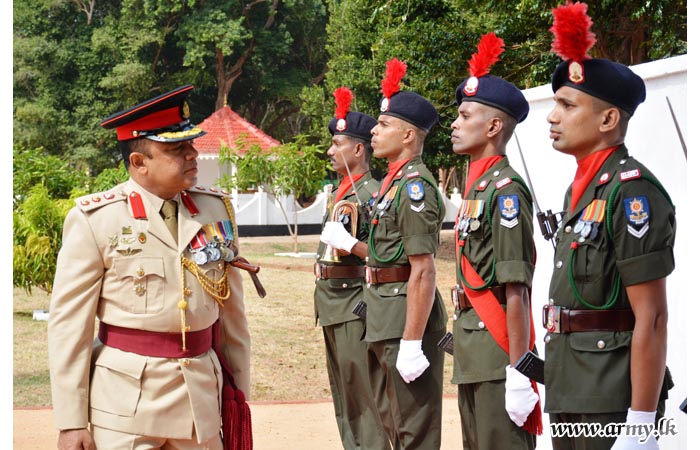 A Guard Turnout, presented by 19 Gemunu Watch (GW) troops saluted the newly-appointed 593 Officiating Brigade Commander on arrival at the Brigade Headquarters in conformity with military traditions.