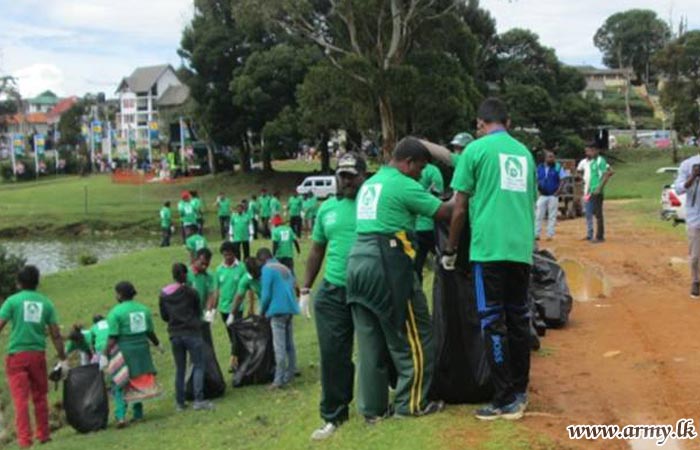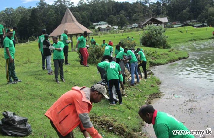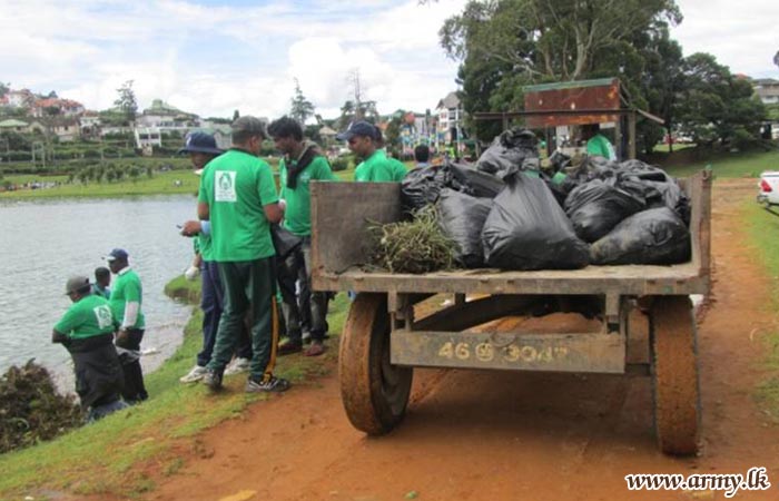 Troops of the 3 (V) Sri Lanka Sinha Regiment (SLSR) in the 11 Division of the Security Force Headquarters - Central (SFHQ-C) cooperated with the Nuwara Eliya Municipal Council authorities, for cleaning of the surroundings near the George Lake on account of ‘Nuwara Eliya Wasantha Festival’.