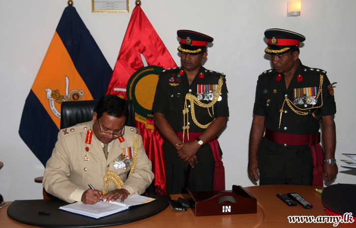 The outgoing Commander placed his signature in a formal document to symbolize the relinquishment of his office at Kilinochchi to assume duties shortly as the new Deputy Chief of Staff.