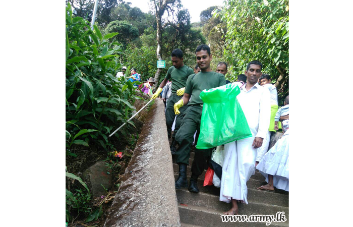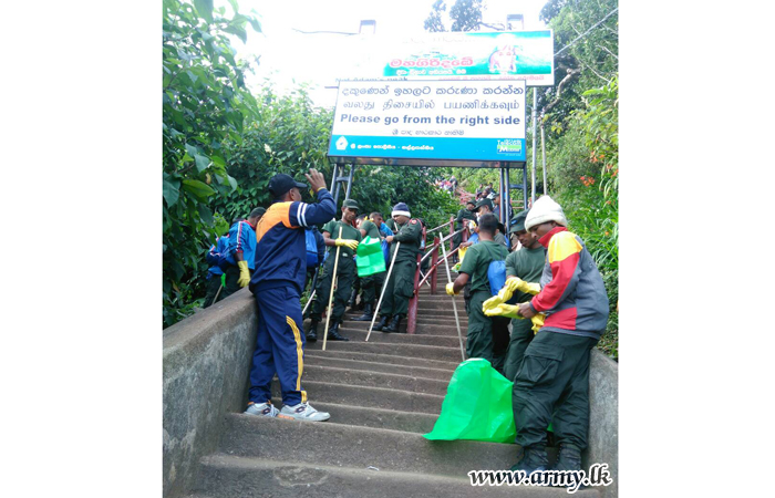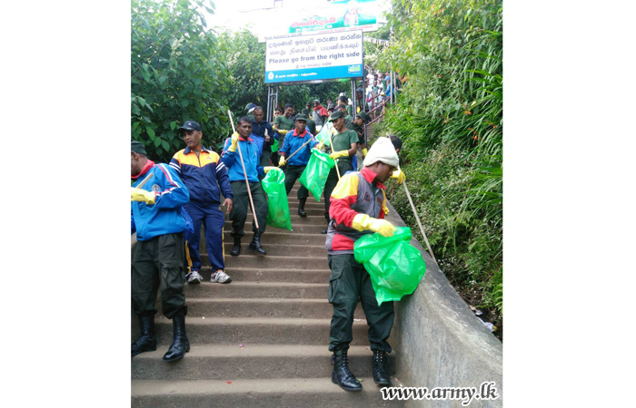 Troops of the 19 Sri Lanka National Guard (SLNG) of the 112 Brigade under the 11 Division of the Security Force Headquarters - Central (SFHQ-Cen) cooperated with the ‘Environment is Sacred’ programme of the Central Province Ministry of Environment and Agriculture, meant to rid garbage surrounding the ‘Sripada’ premises on Monday (23).