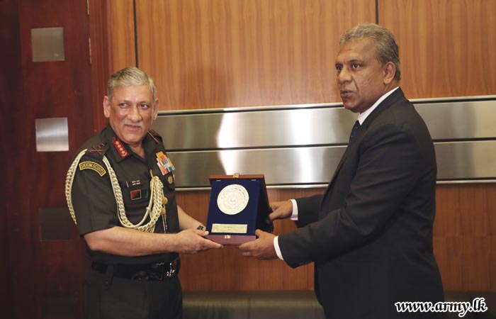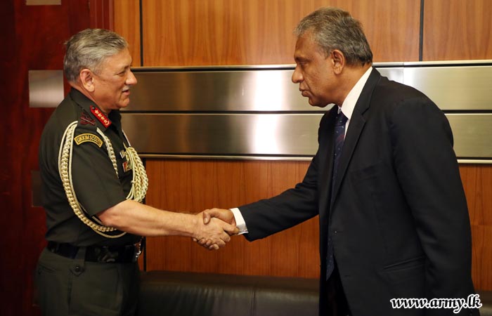 The visiting General Bipin Rawat, Chief of Army Staff of the Indian Army, making another important pause at the Ministry of Defence, had a cordial meeting with the Secretary to the Ministry of Defence Mr. Kapila Waidyaratne PC this afternoon (14) as part of his day's itinerary.