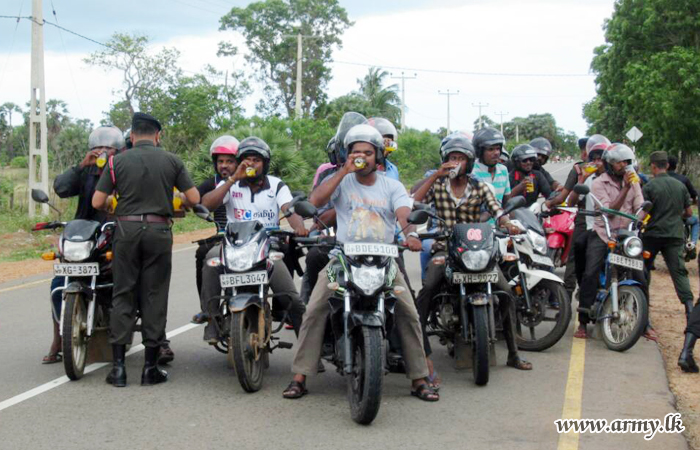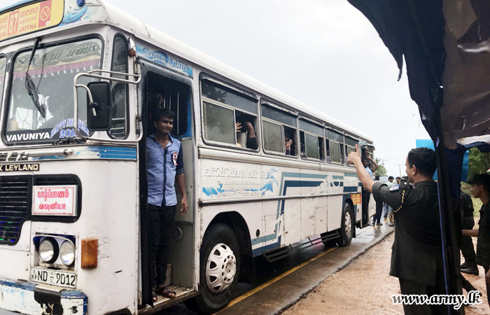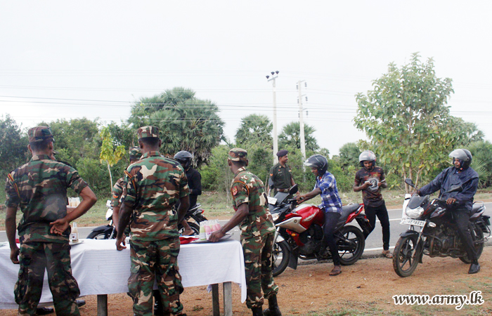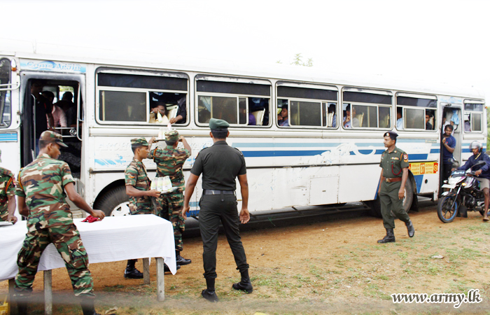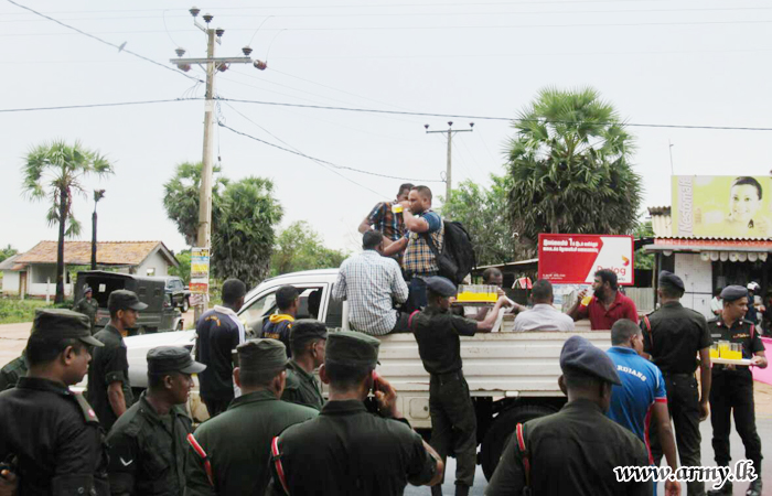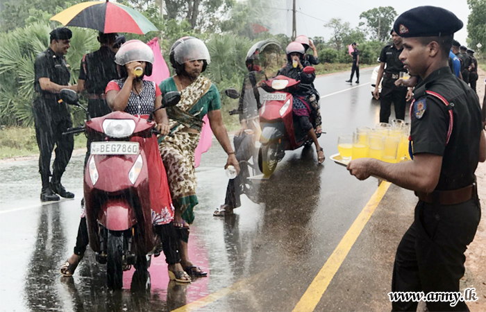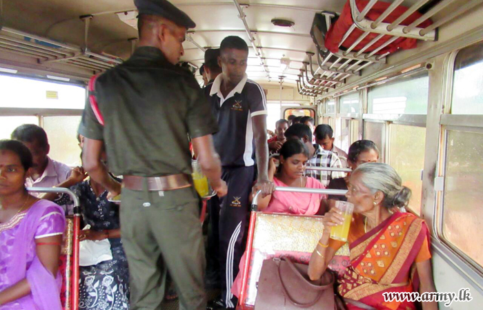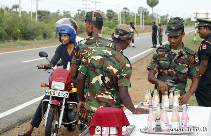 Meanwhile, 12 Vijayabahu Infantry Regiment troops of the 552 Brigade in the 55 Division on the directions of Brigadier Jayantha Gunaratne, General Officer Commanding, 55 Division of the Security Force Headquarters-Jaffna in a 'Dansela' offered milky refreshments to all those returning to Jaffna in vehicles at Iyyakachchi on Friday (18) after their participation in different memorial events in Vellamullivaikkal and other areas.