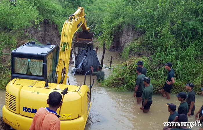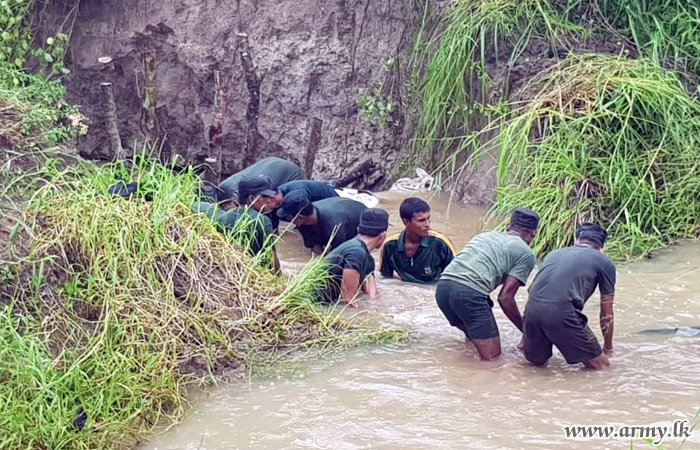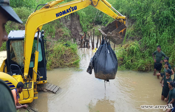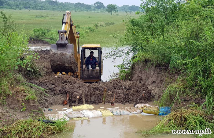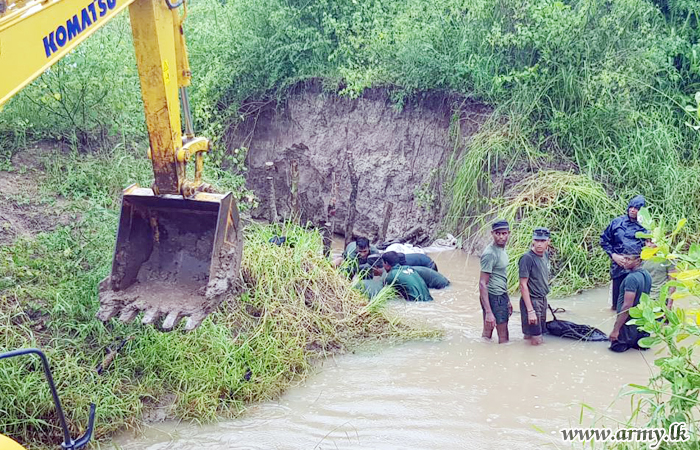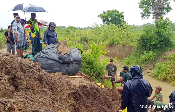 Alert Army troops of the 16 Gajaba Regiment (GR) of the 143 Brigade of Colombo-based 14 Division under the Security Force Headquarters - West (SFHQ-West) Wednesday (23) evening hurried to flood-threatened Moriyakulama area in Karuwalagaswewa and prevented any imminent complete burst of the bank of Moriyakulama agricultural canal by stacking as many sand bags as possible, atop most vulnerable patches.