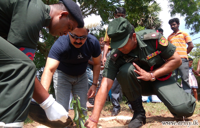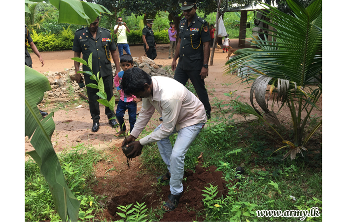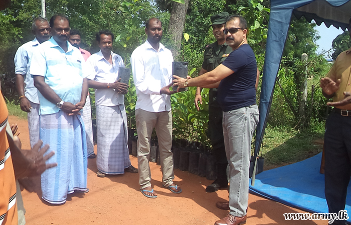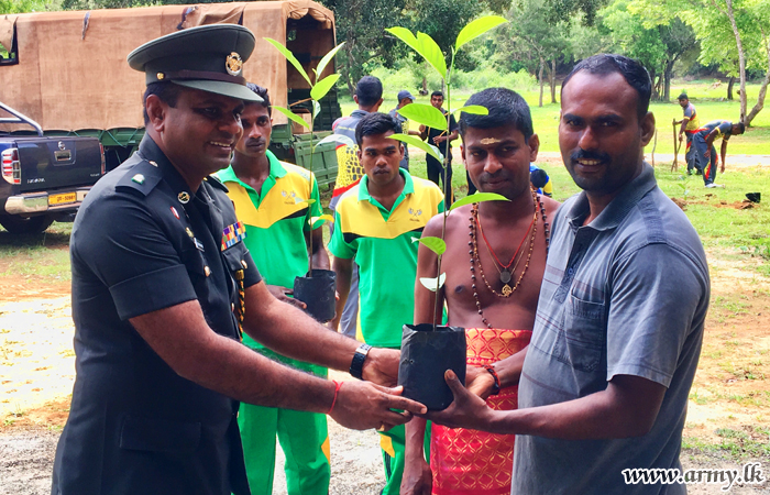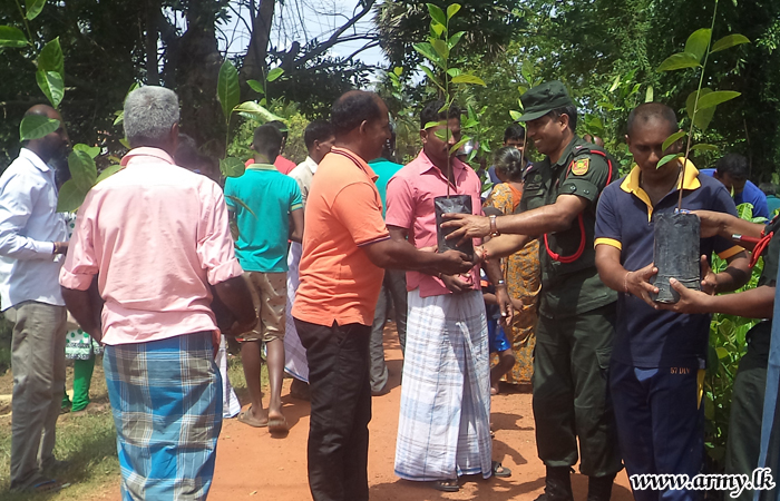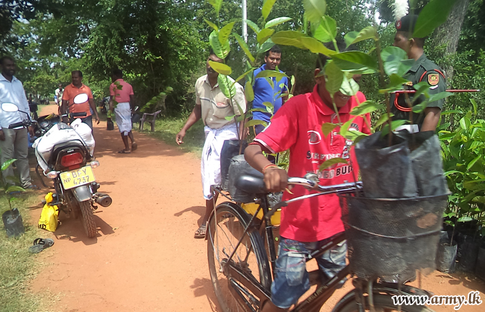 Saplings of Jak, Palu, Weera, Orange, Arecanut, Breadfruit and many other varieties were planted in compounds and on roadsides after distributing those plants under the programme, initiated on the instructions of Major General Vijitha Ravipriya, General Officer Commanding (GOC), 57 Division with the blessings of Major General Niyshshanka Ranawana, Commander, Security Forces - Kilinochchi (SF-KLN).
