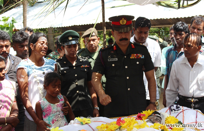 Accordingly, 6 Sri Lanka Sinha Regiment (SLSR), 6 (V) SLAWC and 14 (V) Sri Lanka National Guard (SLNG) troops of the 57 Division on the directions of respective Commanding Officers, Brigade Commanders of the 572 and 573 Brigades and the 57 Division, General Officer Commanding (GOC), swiftly took steps to put up temporary shelters, provided cooked meals, and facilitated all other needs of the family within a short time in consultation with the deceased’s family members, including both daughters serving.