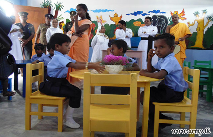 Construction of the pre-school was supervised by the General Officer Commanding 54 Division, Major General Athula Galagamage, on the instructions of the Security Force Headquarters - Wanni (SFHQ-W) and was completed in a record short time of 26 days.