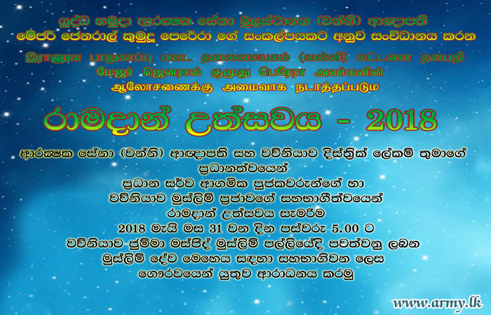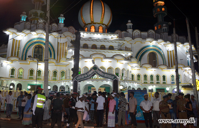 Major General Kumudu Perera, Commander, Security Forces - Wanni (SF-W) took part in the event as the Chief Guest at the invitation of the Chief Moulavi of the Jumma mosque, together with Mr Somaratne Vidanapathirana, District Secretary for Vavuniya and several senior tri-service Officers.