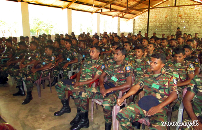 35 Army personnel including one Officer of 1 Sri Lanka Light Infantry of 59 Division, 14 Vijayabahu Infantry Regiment of 68 Division and 23 Vijayabahu Infantry Regiment of 64 Division attended the series of educative lectures during May 21 - June 16, conducted by a combined team of the Mullaittivu-based Disaster Management Centre, Air Force Officers, Naval Officers, Special Forces Officers and a few others.