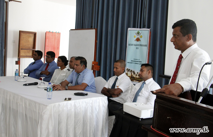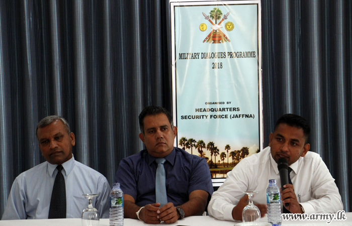 A gathering of 60 Officers representing tri-services, Police and the Civil Security Department recently attended a programme, titled ‘Military Dialogues 2018’organized by the Secretariat for Coordinating Reconciliation Mechanisms (SCRM) in collaboration with the Ministry of Defence and the Ministry of Law and Order in Jaffna.