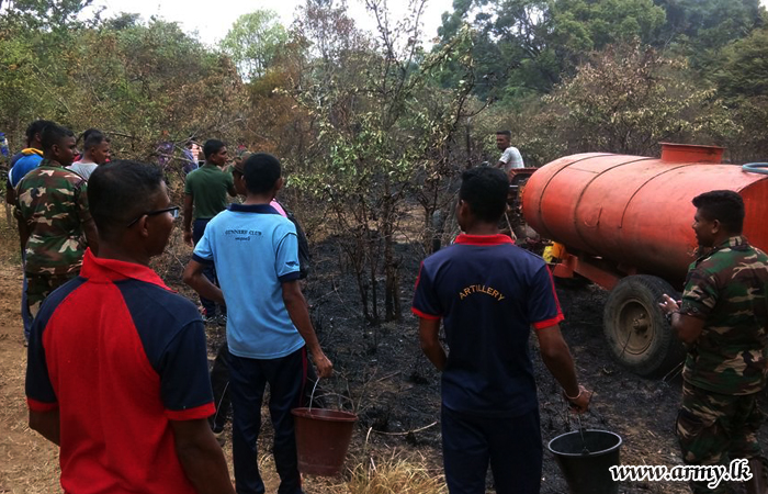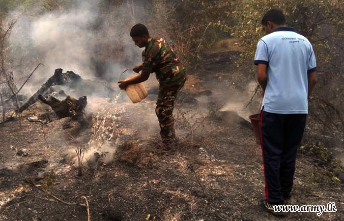 On being informed of its possible spread it to the entire National Forest Reserve, the Commander immediately dispatched more than 50 Army personnel with necessary equipment to bring it under control within a few hours since the area is very crowded with devotees and tourists. 7 & 9 Sri Lanka Artillery troops participated in the operation to bring the situation under control within a matter of few hours. Prevailing dry weather conditions were attributed to the sudden outbreak of this fire in the affected area.