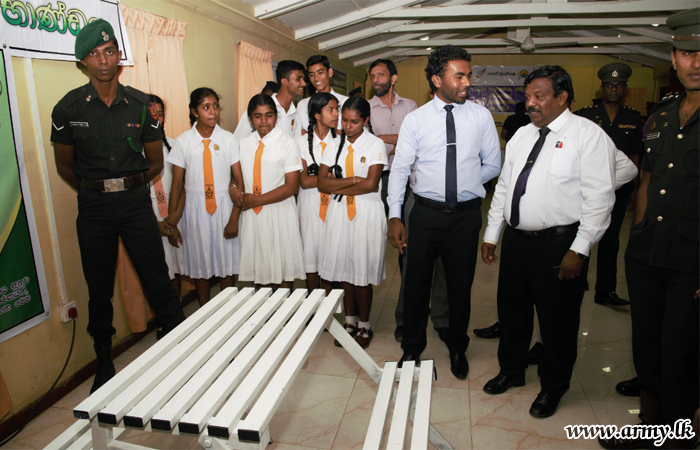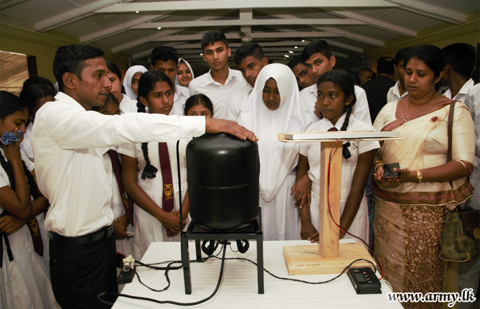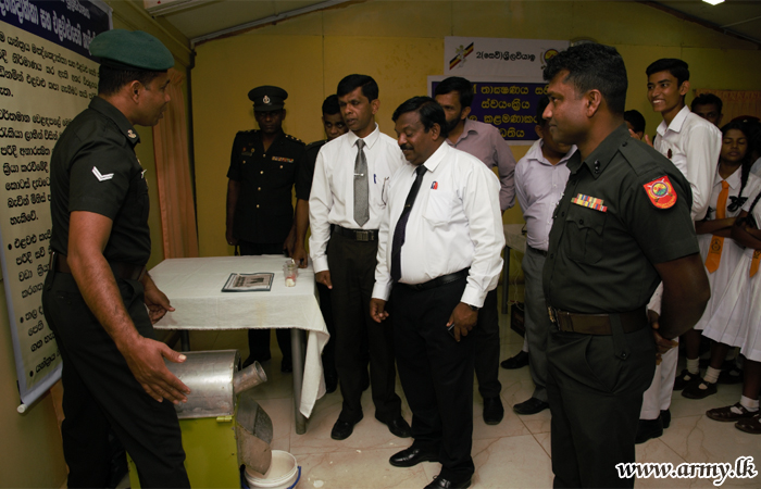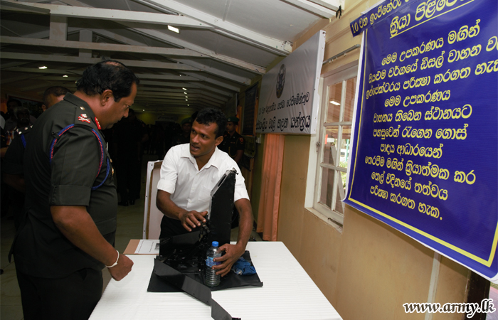 The first place was won by 10 Corps of Engineer Services (CES) for their production of the vehicle engine injector nozzle tester and the second place went to a sample musical instrument made by 2 Sri Lanka Rifle Corps (SLARC) troops. The third place was won by troops of the 112 Brigade for their production of the putty cutting machine.
