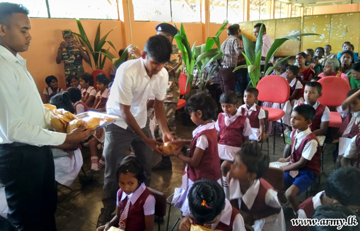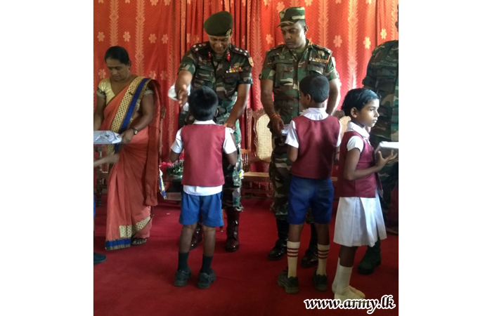 20 Vijayabahu Infantry Regiment (VIR) troops in the Security Force Headquarters - Kilinochchi (SFHQ-KLN) distributed a stock of school accessories among school students in the Skandapuram GTM School on Friday (3).